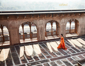 Exclusive Reception Wear Designer Traditional Sari. Motifs, Resham Zari Thread Embroidered Bordered Orange Tissue Silk Weaving Saree of 5.50 mts. with Tassels. Red/Maroon Multicoloured Unstitched Silk Blouse of 0.80 mts. Dry Clean only.
