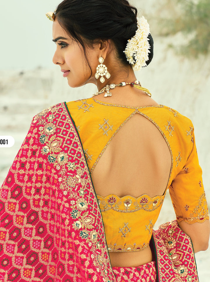 Destination shaadi wear red banarasi bandhani patola georgette silk sari. Indian traditional marriage attire. Jaipuri/Gujarati art exclusive ethnic wedding outfit. This red/orange bandhej patola bridal saree is perfect for weddings, pheras & reception looks. From the zari border to the floral patola weave, this saree is crafted for picture-perfect bridal moments. Sequins, stones, zari weaving, resham thread embroidered and bordered saree of 5.50 mts. with tassels. Yellow silk unstitched blouse with work of 0.80 mts. comes alongwith a plain blouse also.