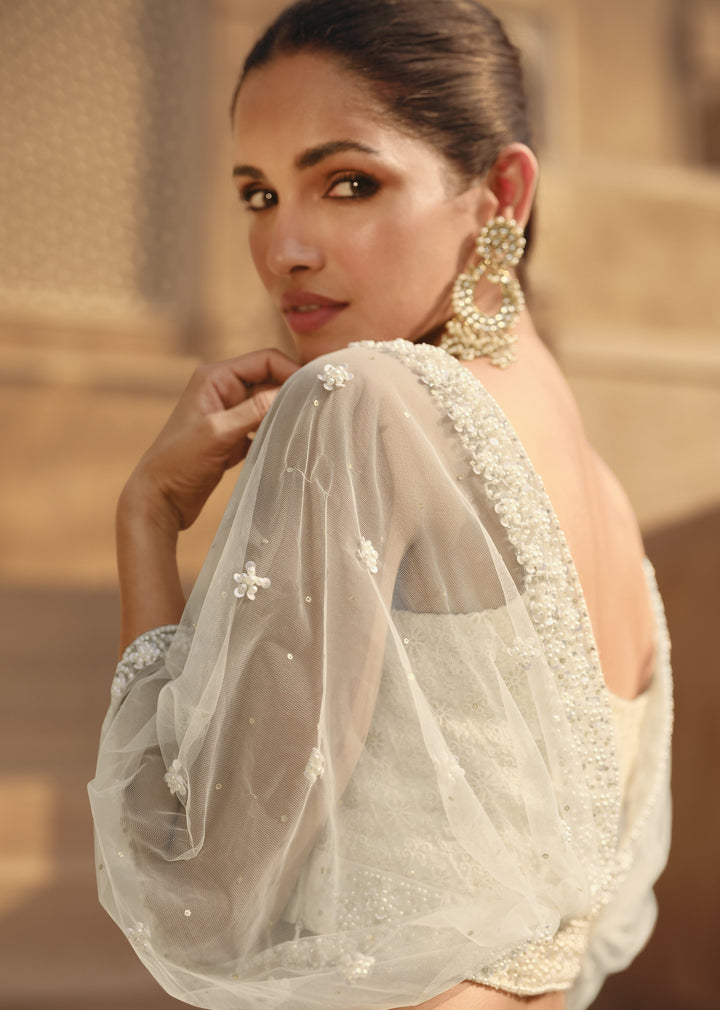 Celebration wear indo western designer dress. White georgette lengha crop top shrug set. Shaadi engagement party readymade stylish fusion attire. Ceremonial bridesmaid outfit. Sequins, moti, zari resham thread embroidered ghaghra available in sizes M, L, XL, XXL. It's paired with a ready crop top blouse and ornated shrug.